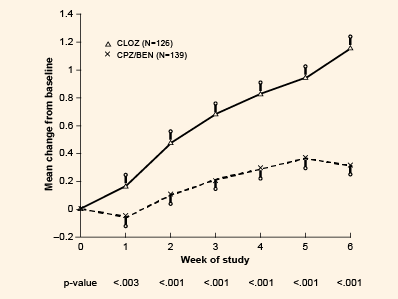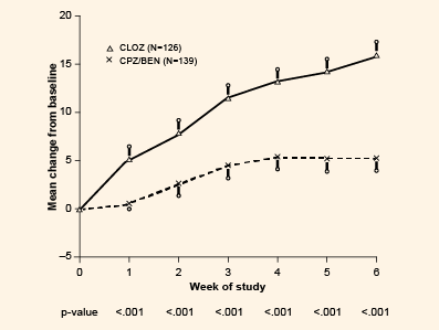 A meta-analysis has shown that clozapine-treated patients are nearly 2.5 times more likely to experience a 20-30% decrease from baseline in total BPRS score compared with those treated with typical antipsychotics (p=0.001).7