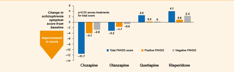 As well as superiority over typical antipsychotics, clozapine has also demonstrated greater clinical efficacy than atypical antipsychotics in TRS patients.3,6 Trends for greater improvement in positive and negative syndrome scale (PANSS) scores are supported by significant reductions in total PANSS score6 (see Figure 3).
